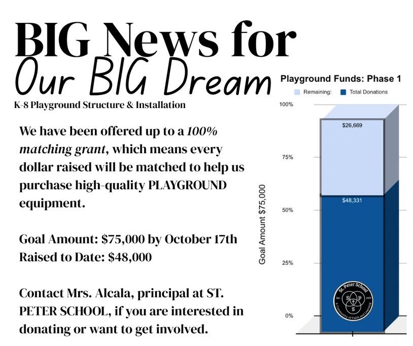 To achieve the BIG dream of St. Peter School's first K-8 playground, we need your help. Your support, whether through donations, volunteering, or spreading the word, will be invaluable as we embark on this journey together. We envision a playground that embodies the spirt of St. Peter School--inviting, inclusive, and inspiring.